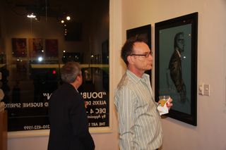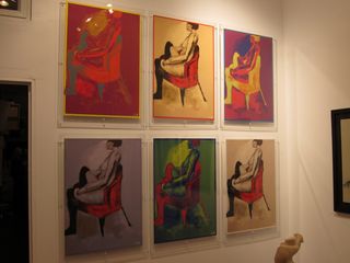 *And more: “Man With Tie” a narrative piece that evokes a mysterious guy who seems to peer at the viewer from the shadows. Or “Man In Jacket” a true study in fabric drawing, and a regular guy who fashions a wrinkly blazer while absorbed in thought. The “Red Chair” iris print series one guest described as the “Warholian-Schiele” of the show. Also, the three piece mixed media three dimensional collage that explores the exploitation of the female form in media. Oh, and a green pumpkin, a dog with a jewel toned turban, and a girl with a green skirt.